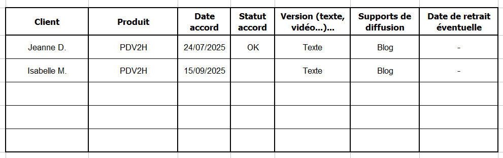 C'est votre bible. Un simple tableau peut suffire. Notez-y qui vous a donné son accord, à quelle date, pour quels supports, et avec quelles options (anonymisation, etc.).